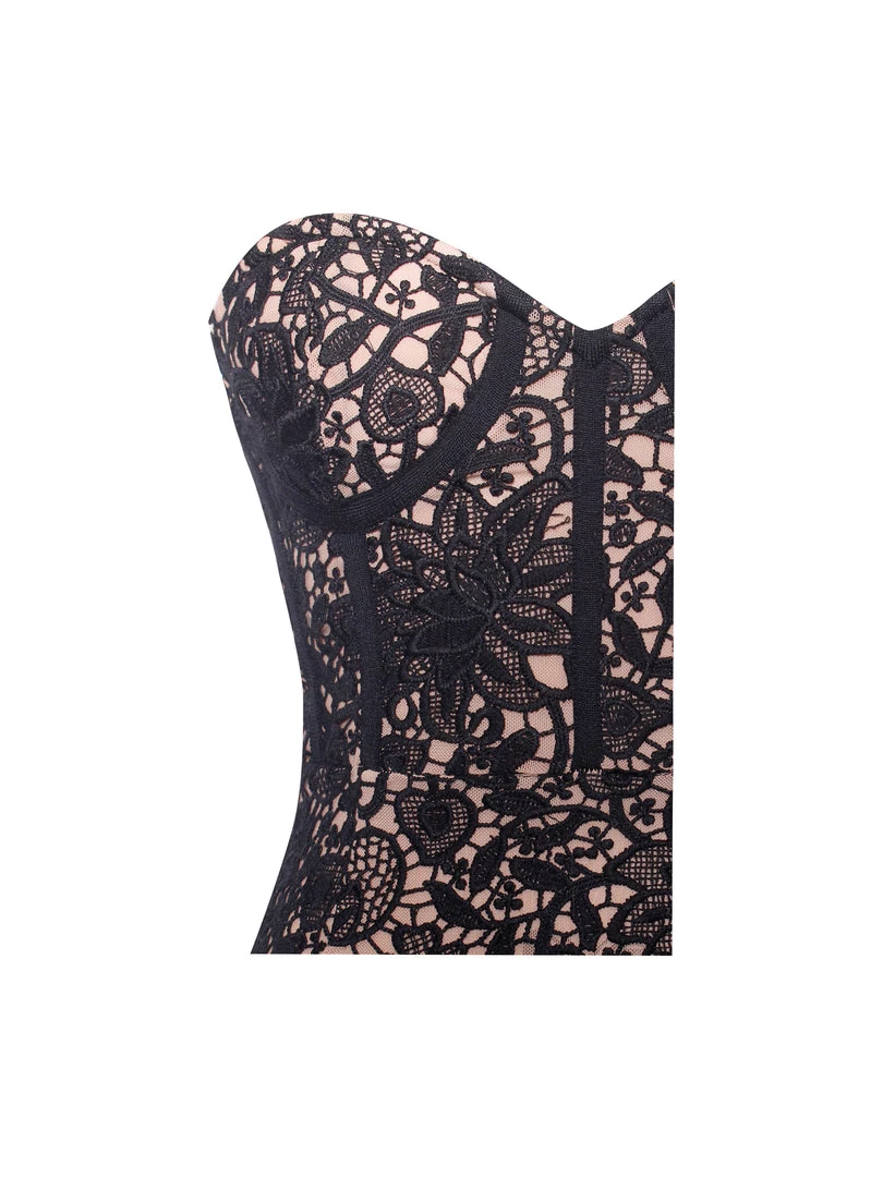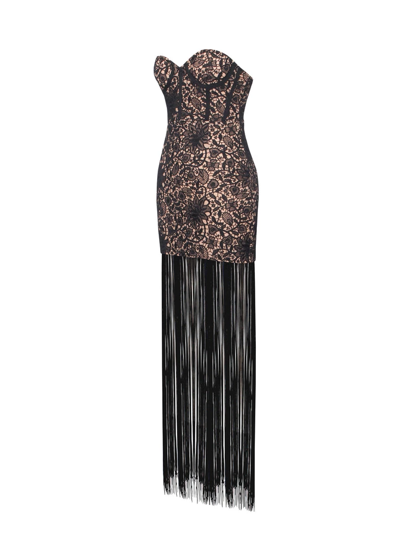 Sexy meets sophistication in this full lace fringed dress. Strapless and nude lined this corset style floor length dress is sure to leave everyone speechless . The built in cups will give you the perfect silhouette . Grab a statement clutch and some scrappy heels to create the perfect picture worthy look .