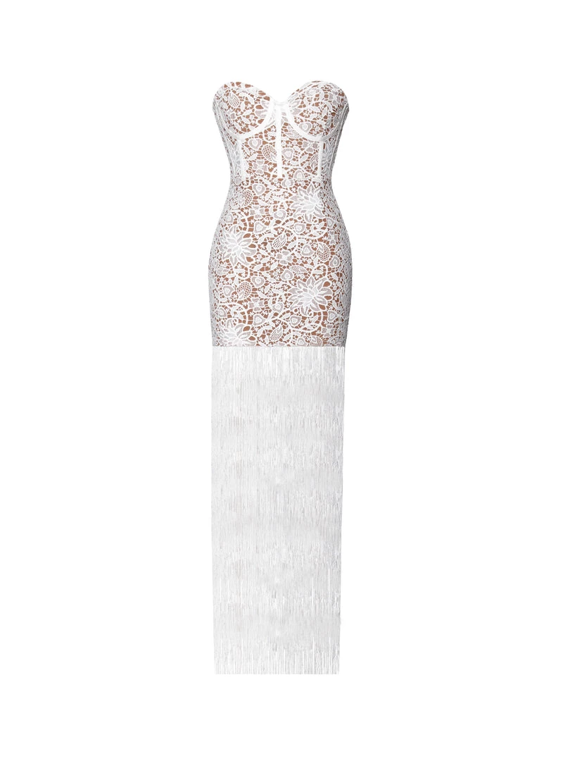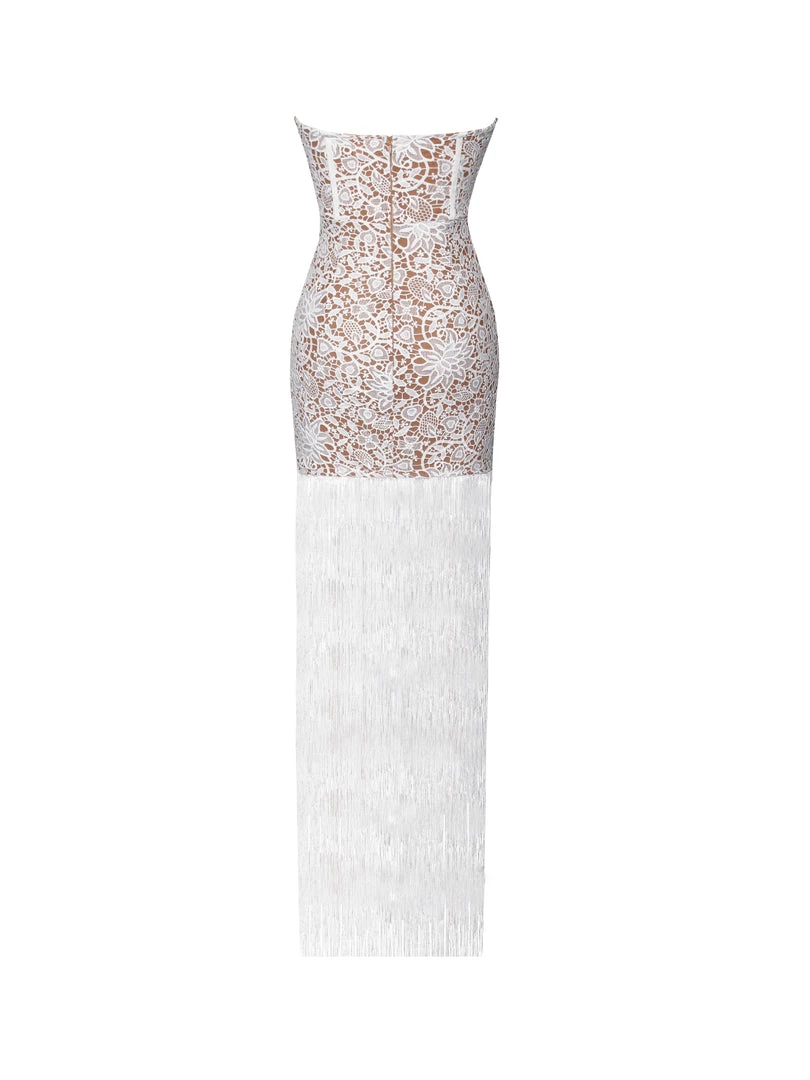 Sexy meets sophistication in this full lace fringed dress. Strapless and nude lined this corset style floor length dress is sure to leave everyone speechless . The built in cups will give you the perfect silhouette . Grab a statement clutch and some scrappy heels to create the perfect picture worthy look .