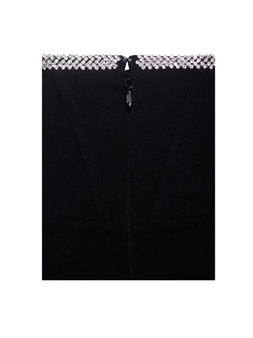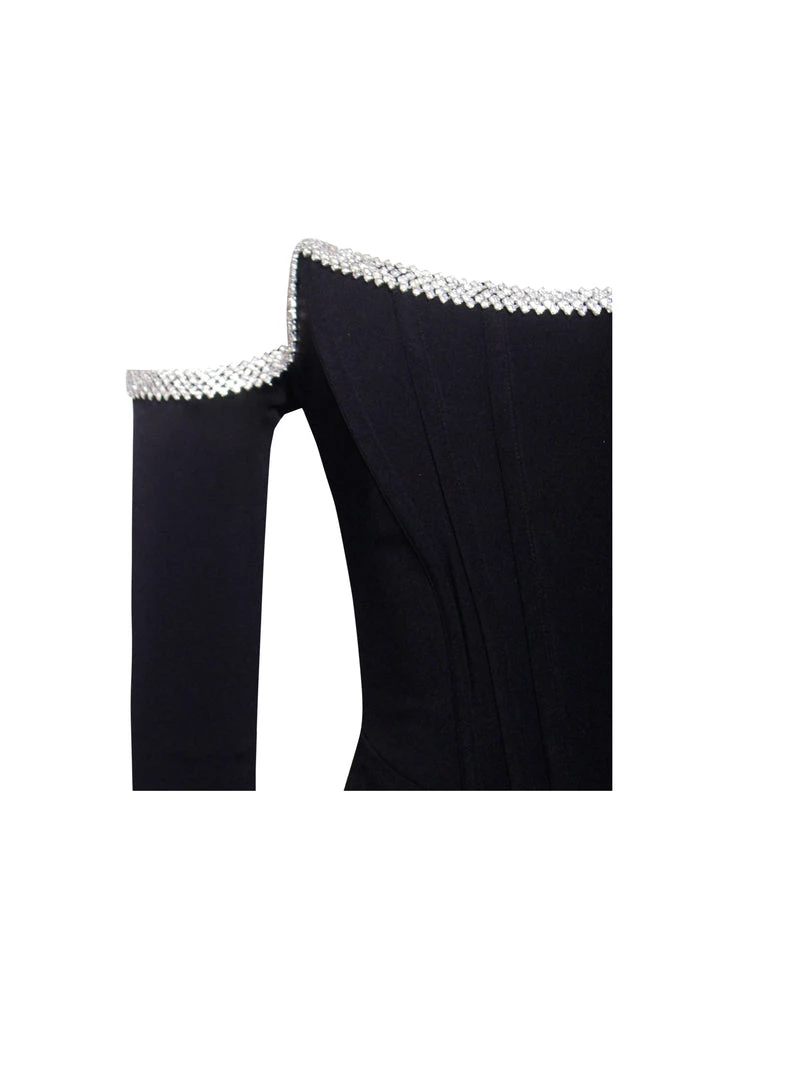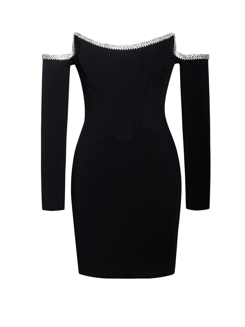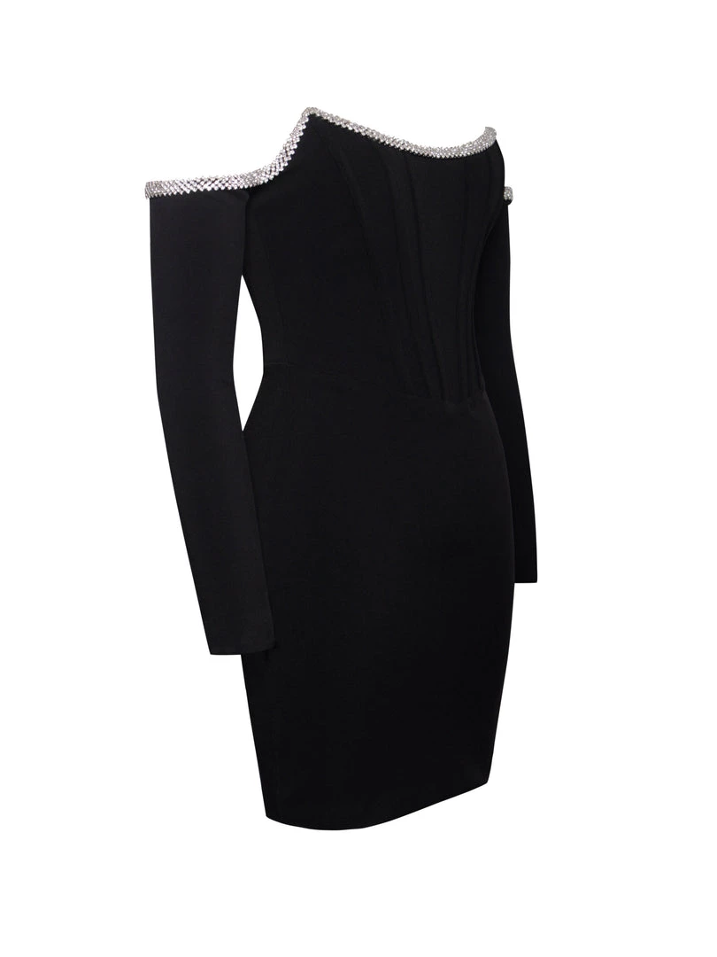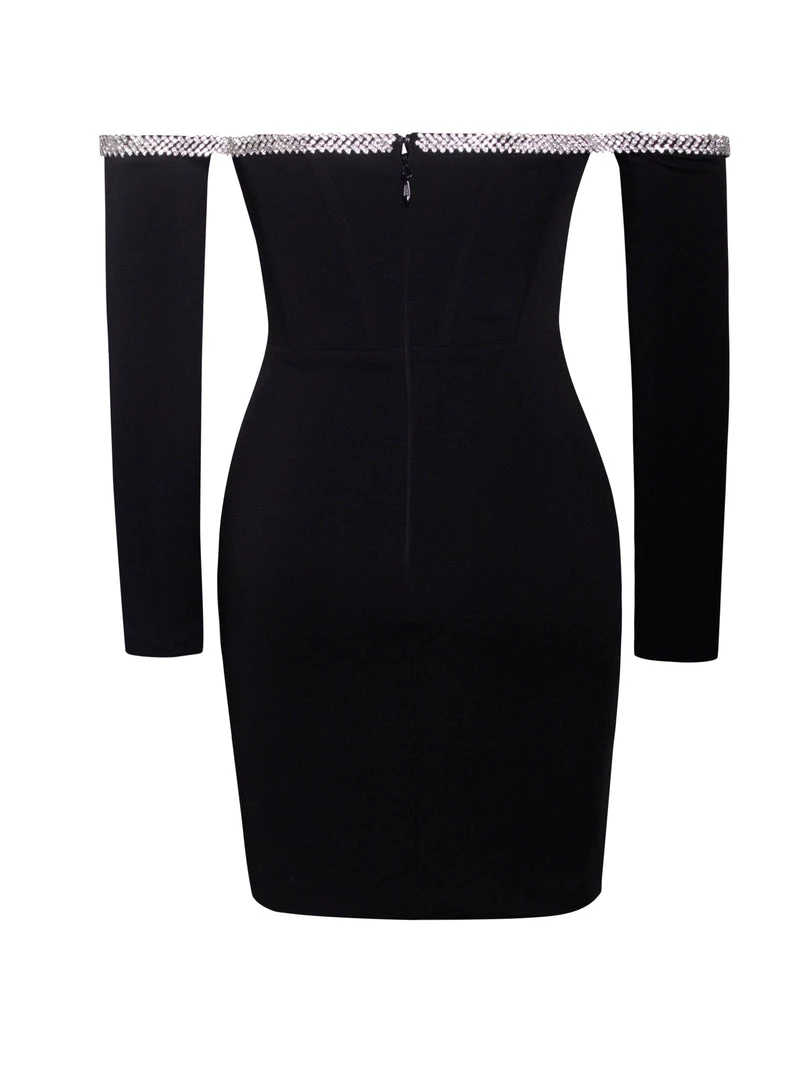 Feel like a million dollars in our stunning off the shoulder Annika mini dress. Cut from our classic stretch crepe, this fully lined gem features hand-placed crystal along the sweetheart neckline and a waist-cinching corset. Pair this “LBD” with a pair of your favorite pumps and a cute shall.