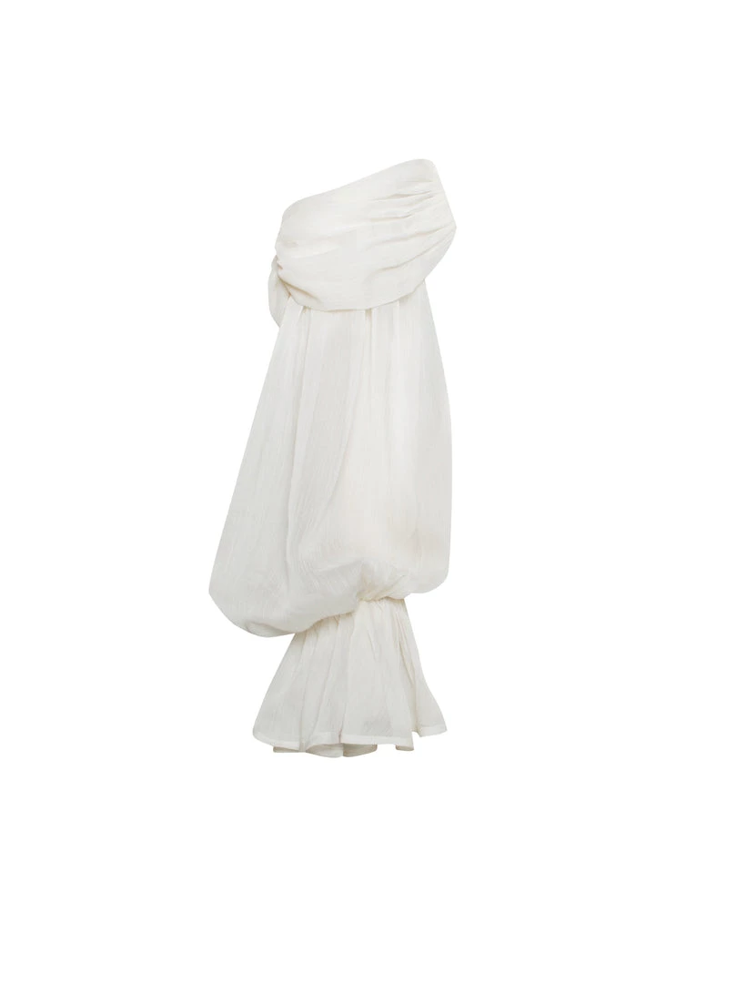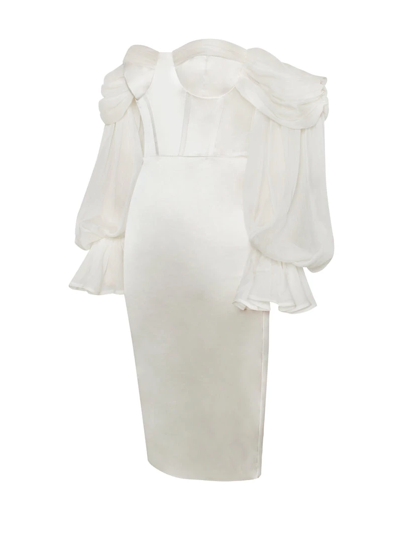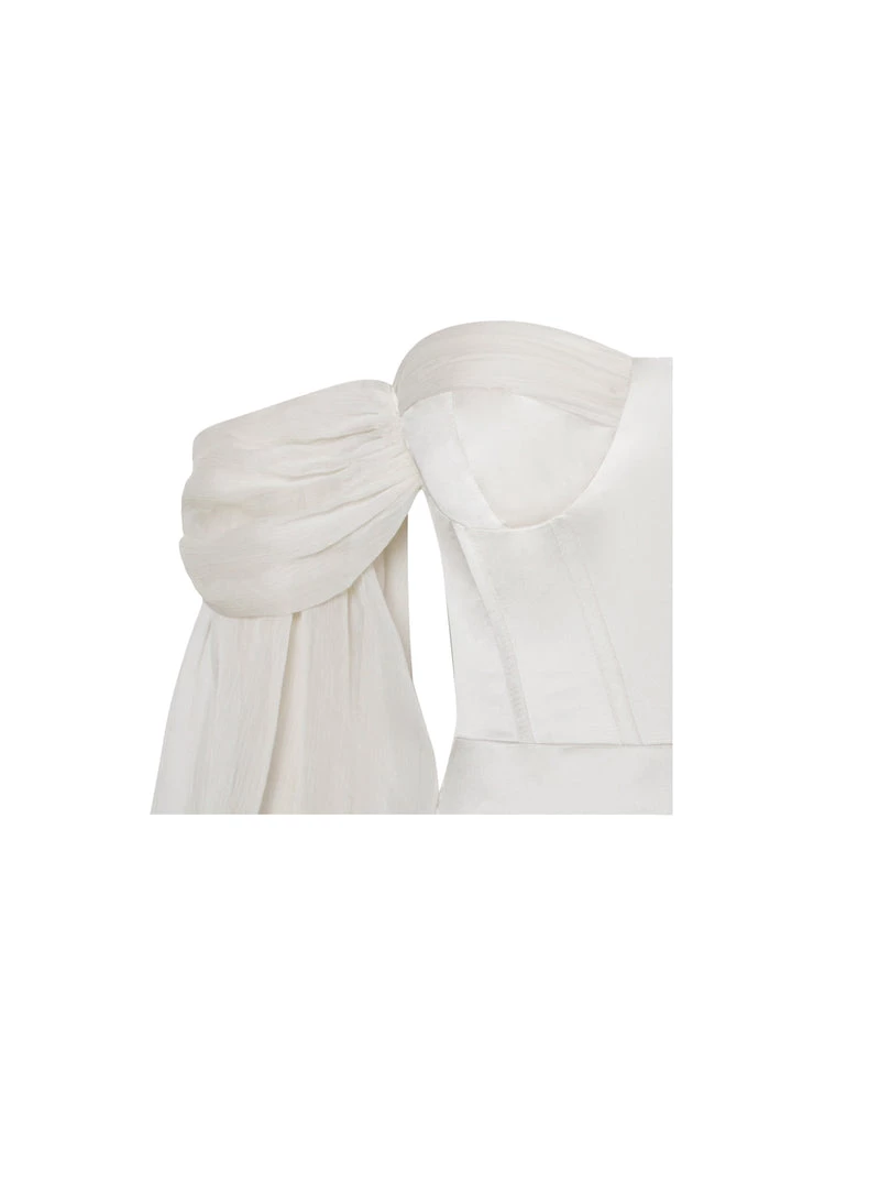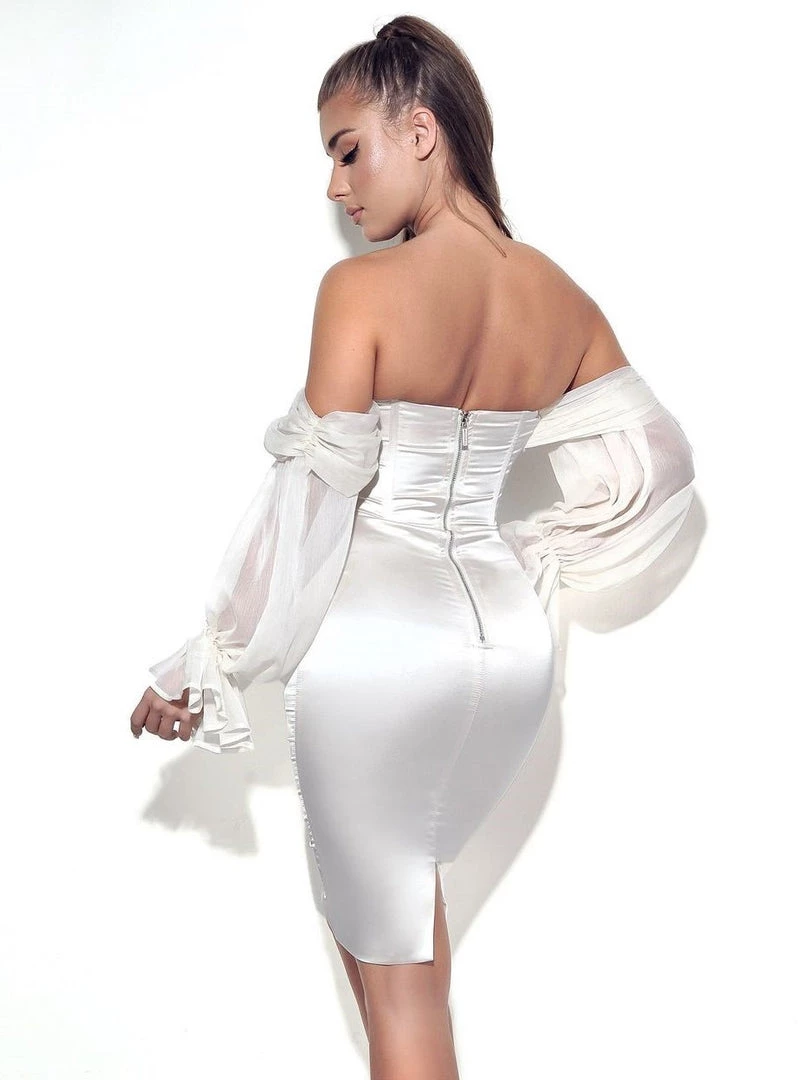 Turn the glamour on in the off the shoulder pearl white Lydia. Cut from a skin glowing pleated luxurious satin. This style features a built-in corset with lightly padded cups and dramatic draping puff sleeves. Feel like a total bombshell and pair with sky-high heels to finish off the look.