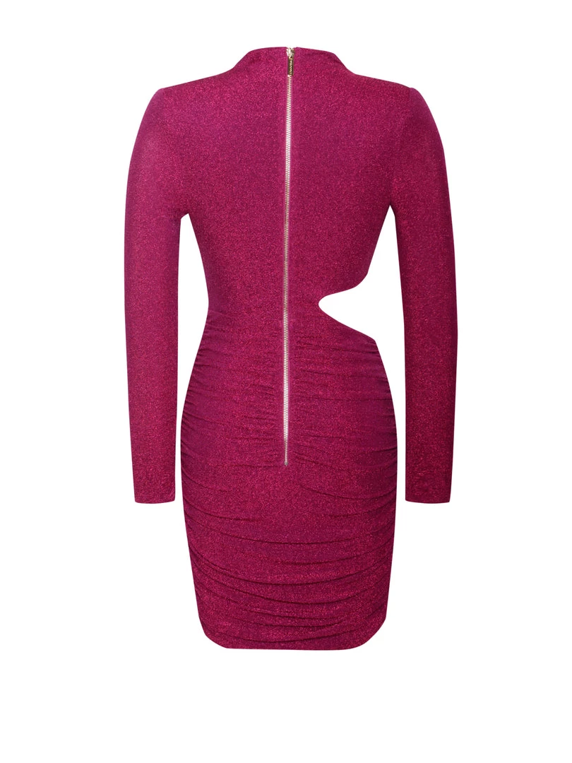 Spice up your wardrobe with this killer Revan dress. Cut from our super stretch metallic fabric this fully lined style is too hot not to wear. With a peekaboo keyhole and cut out on one side, Reva also has an features an exposed zipper that complements any of your gold accessories.