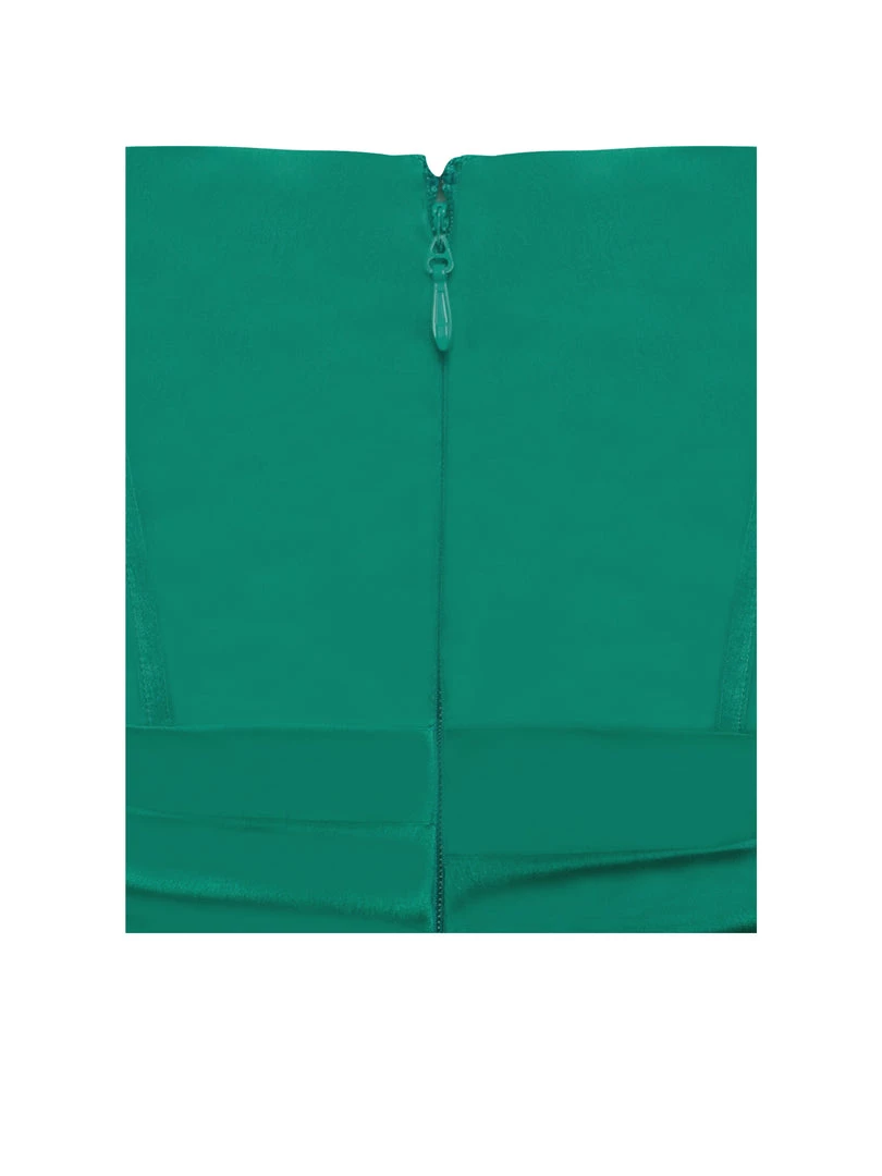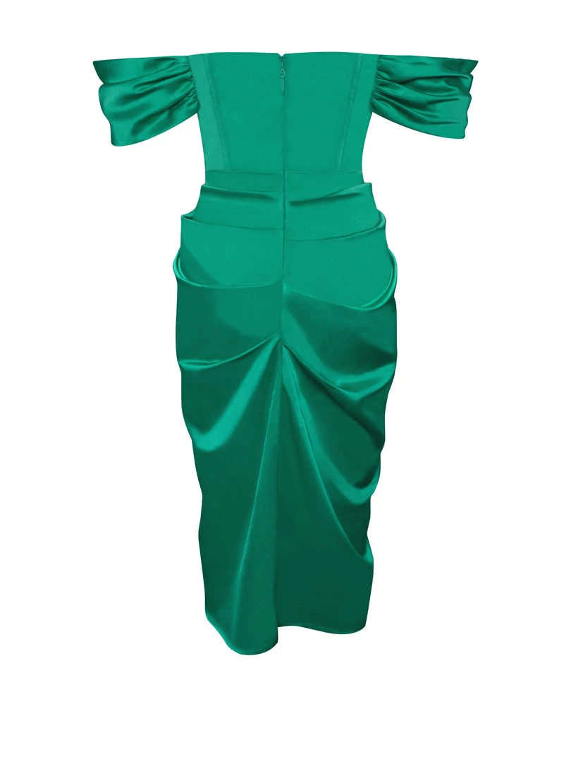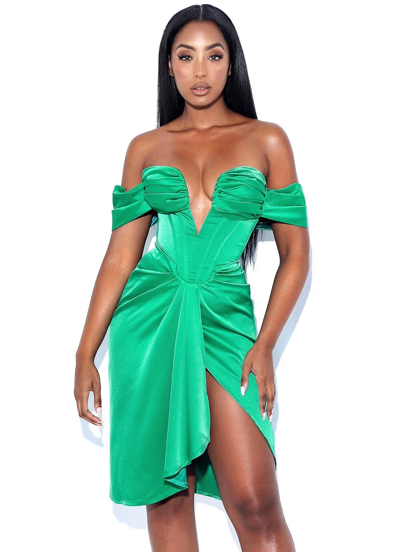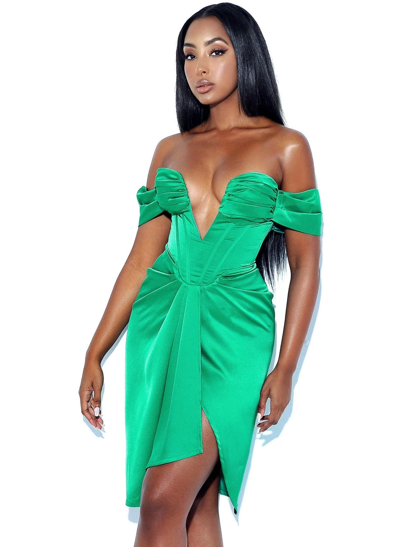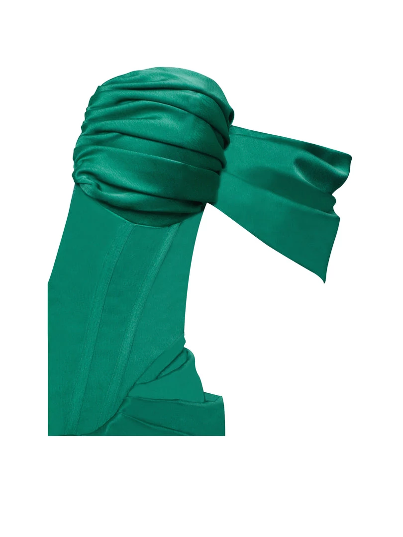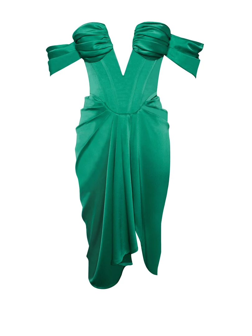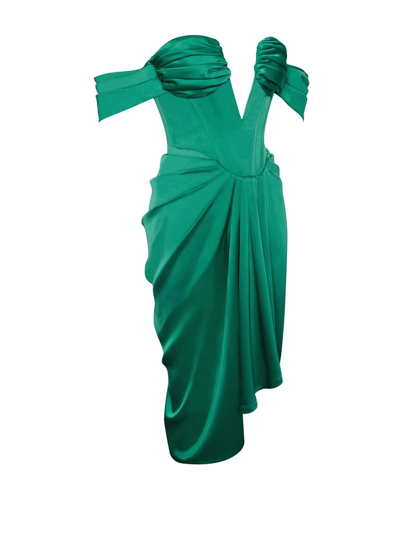 This silky satin dress is an instant hit for any upcoming event. Cut in a gem-colored emerald green satin, this fully lined midi dress is sure to become a classic. With a boned piping corset, a plunging neckline, and padded cups with draping shoulder details. The gathered skirt lends to a midi cut with an asymmetrical hemline. Pair with a gold heel and after summer tan and you’re ready for the fall.