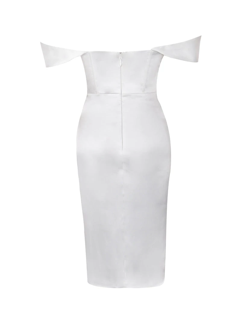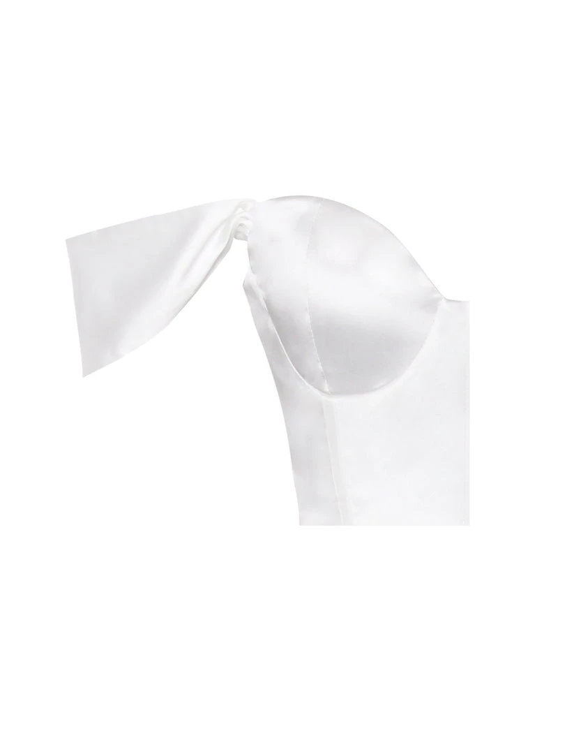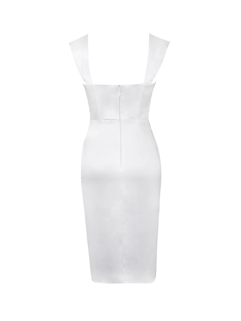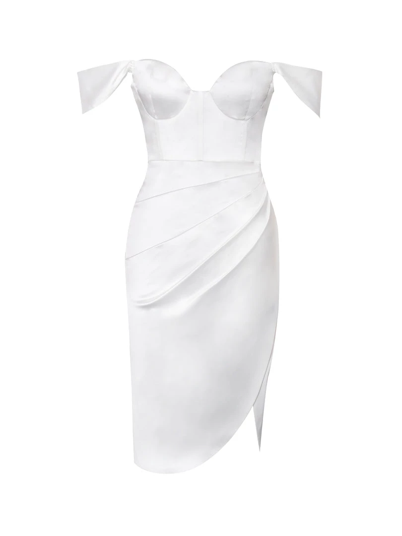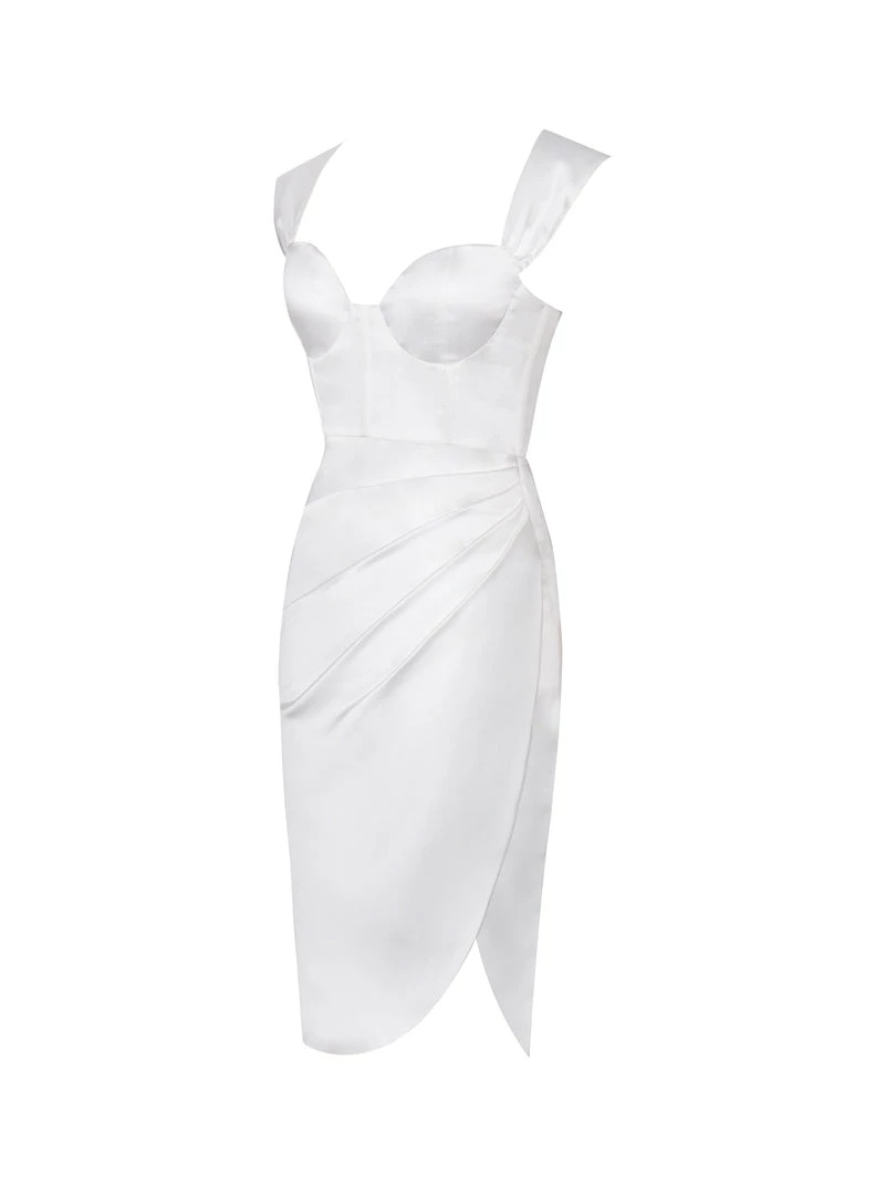 Already an in house favorite. The midi Hedy is perfect for any major occasion. Featuring our white satin fabric and an asymmetrical wrap hem. This fully lined design has corset style boning made for support and lift. Wear the sleeves on or drape them on our shoulders, either way, your look is on point.