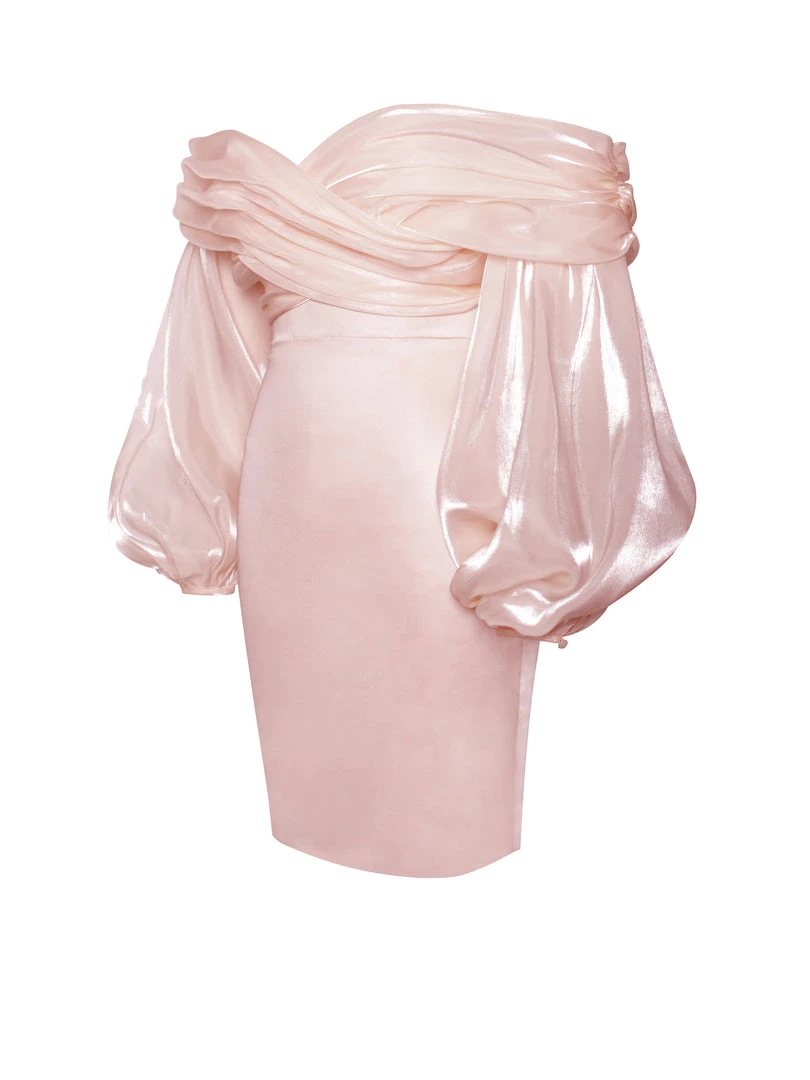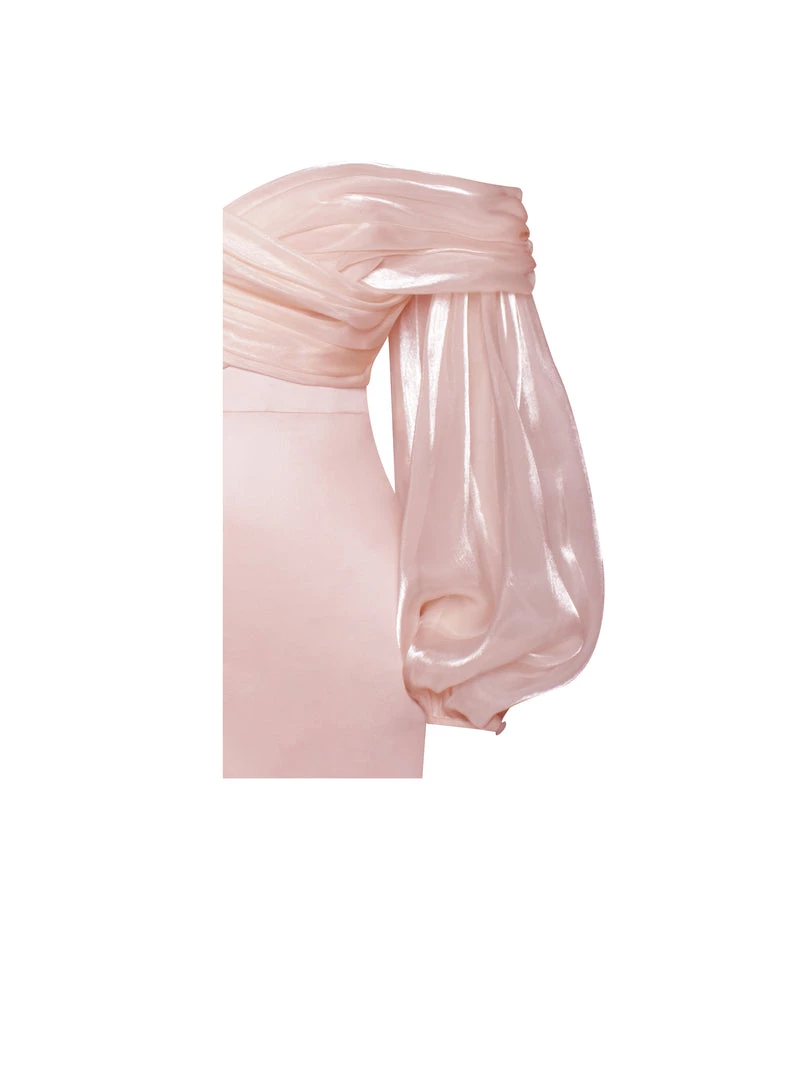Our new Jacey is dreamy in both design and color. Cut in a blushing peach satin, Jacey features a close-fitting skirt and luxurious organza puffed sleeves. The sweetheart neckline bare cleavage as the exposed zipper adds a bit of contrast. Pair clear heel and a white clutch for a pop of color.