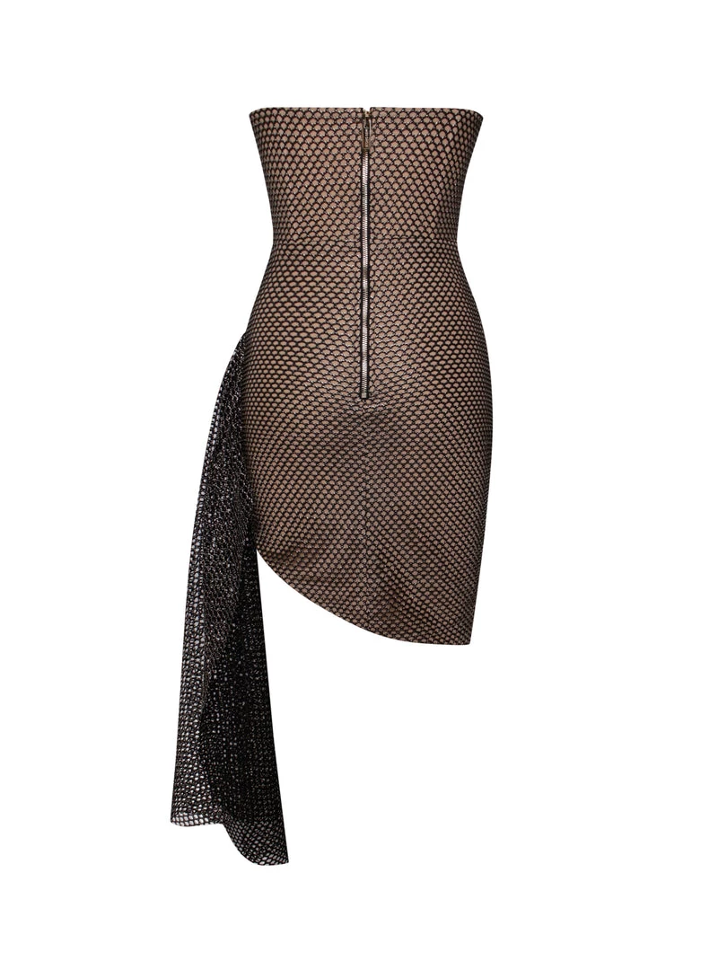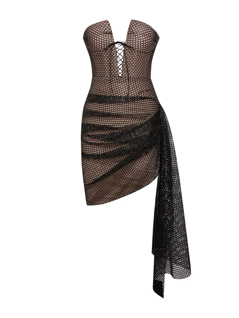 Unlike anything we’ve ever done, Lexi is a fully lined metallic mini. Cut from a glowing metal mesh fabric, this style is very unique. With a lace-up bodice that holds and supports your burst and dramatic draping skirt that gathers at these hips. This show-stopping style speaks for itself. Pair with clear heels and let the dress do all the talking.