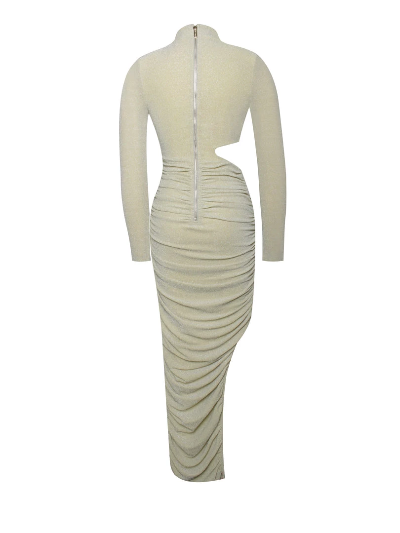 When you mix sexy, stylish, and elegant together you get Payson. Cut from a soft metallic jersey fabric, this maxi features a sexy peekaboo cut-out and matching side cutouts. Designed with a body contouring ruching, this fully lined Payson is the perfect wardrobe addition.