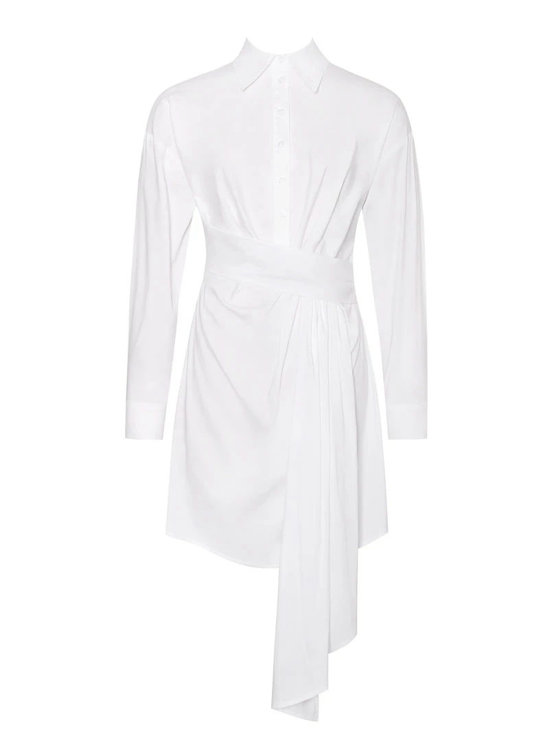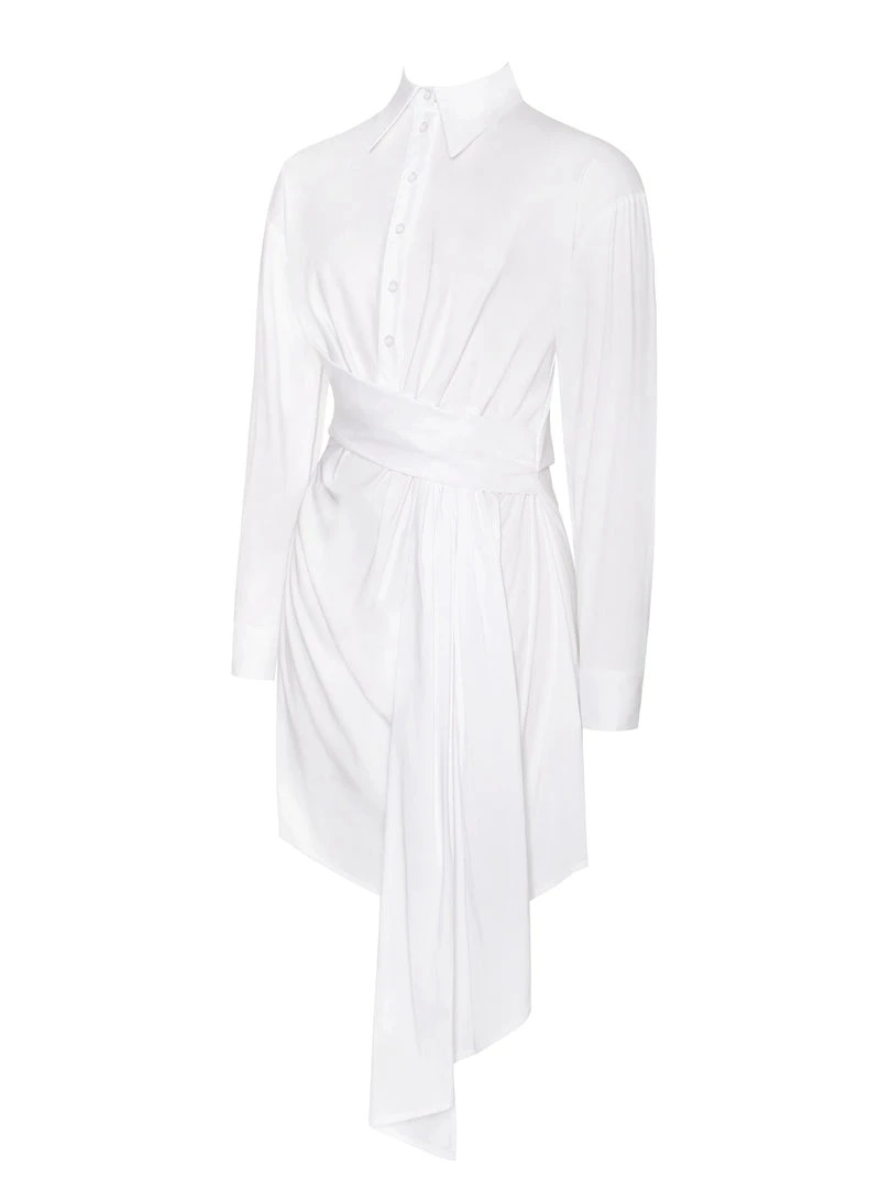 Glam on the go with this draped boyfriend shirt dress . The stretchy shirt fabric offers comfort and style in any setting . Change things up with the adjustable zipper giving you multiple styles in one . The draping along the front gives it a cut above the rest . Grab a tote and take on the day or night in this dress .