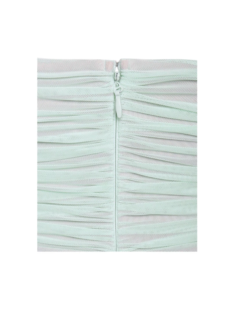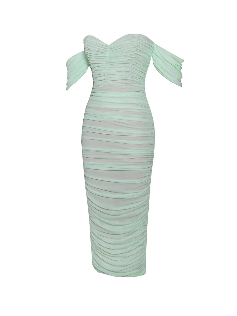 Flattering to the perfect hourglass shape. The very sex Quenby was created from our stretch sheer crepe fabric. This design is fully lined under the mint-colored ruching creating a see-through illusion. With a slit in the back and elegant draping sleeves, Quenby was designed to make you feel sexy and confident.