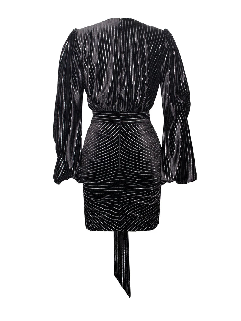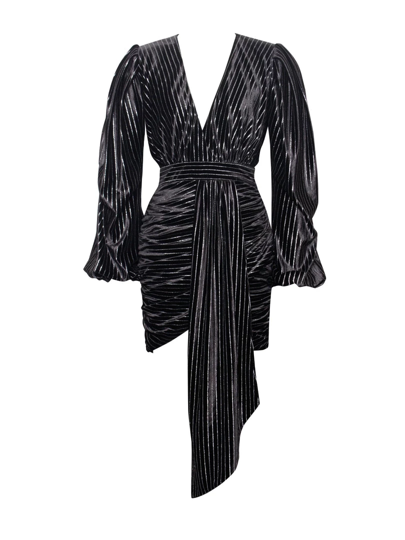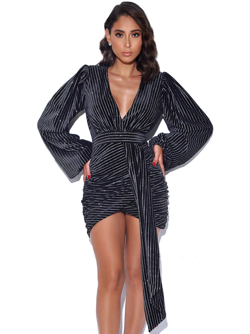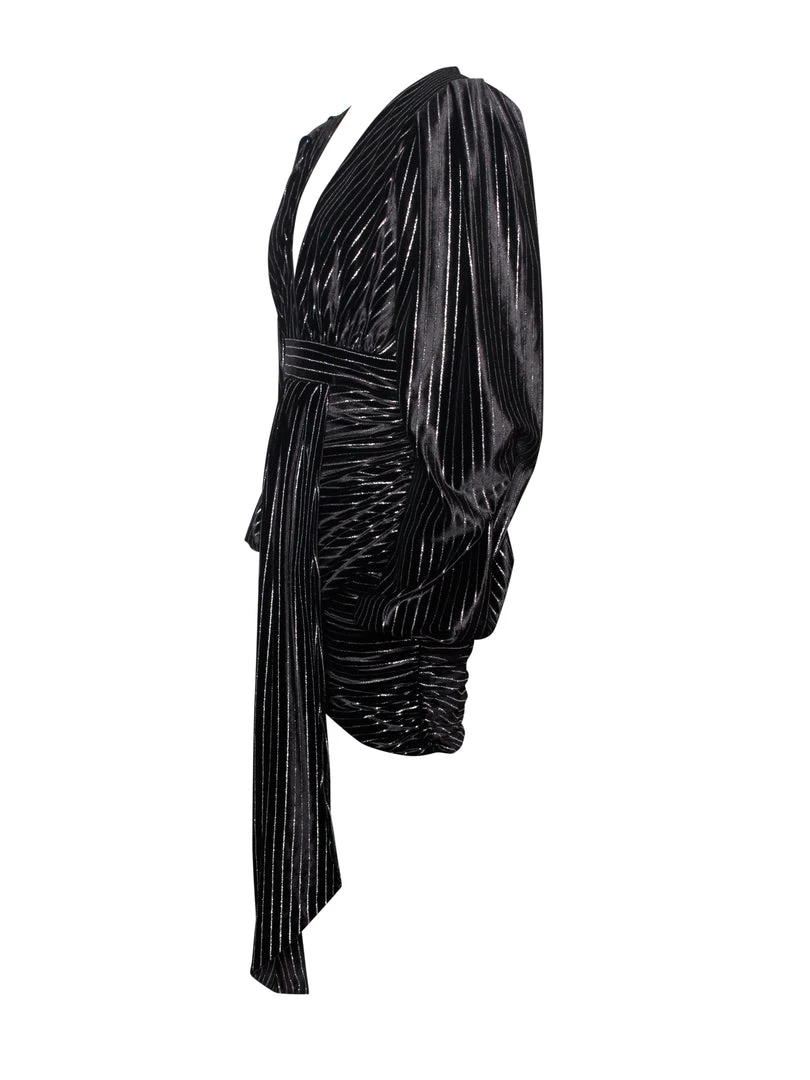With a plunging neckline and dramatic bell sleeves, this velvet mini is love at first try. Designed to accent every curve on the body, the ruching body and draping waist band was made to snatch your waist and highlight your figure. Pair with your favorite dancing heels and get and get ready to float all night long.