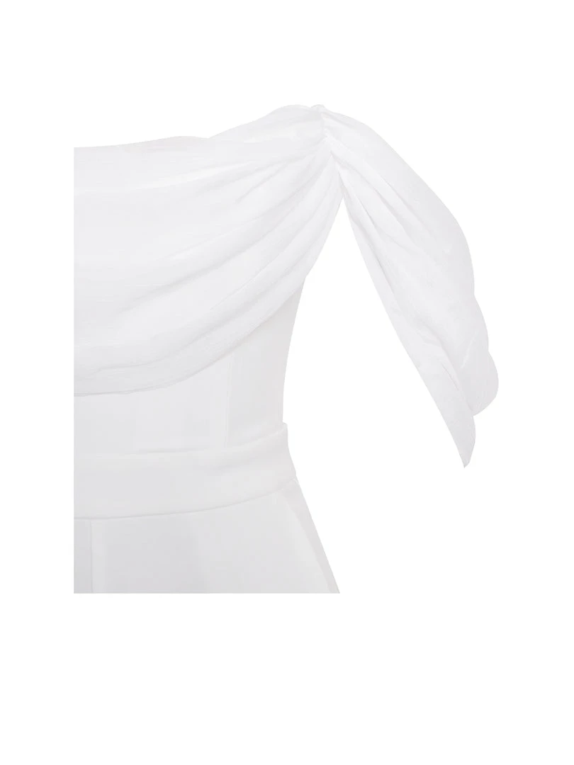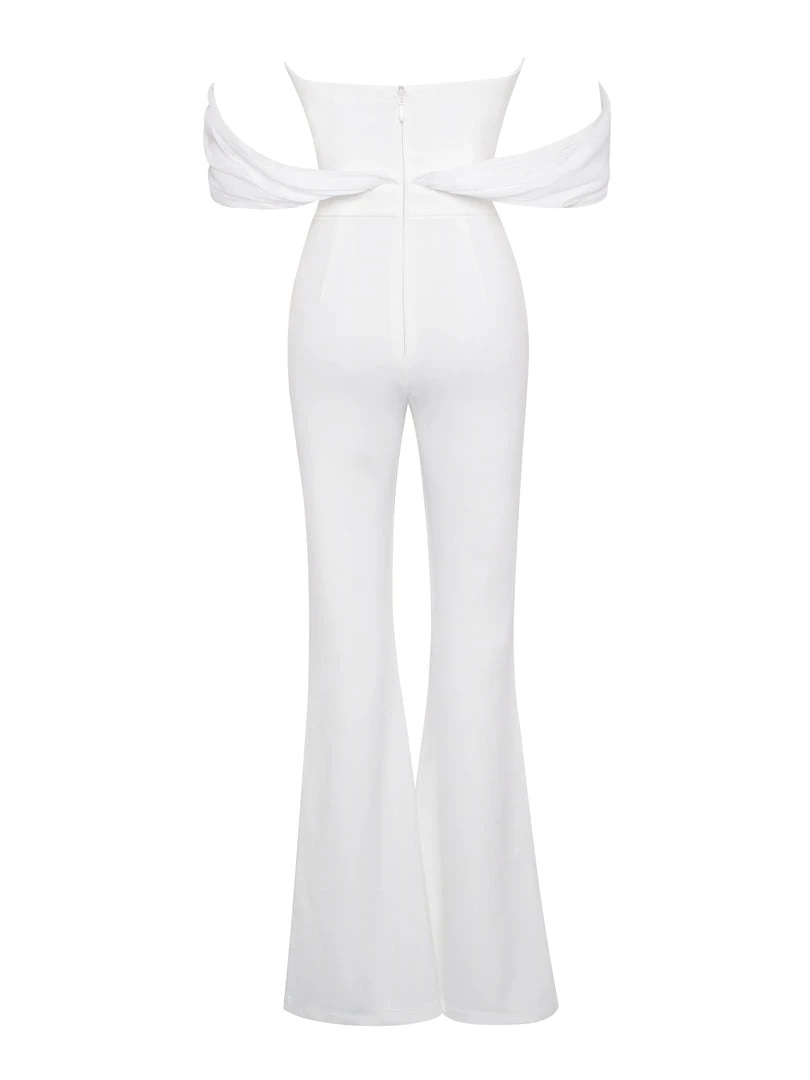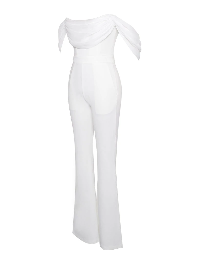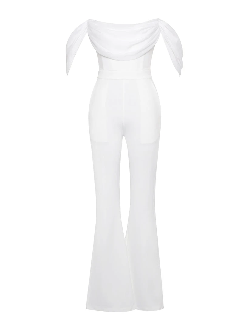 We wanted something soft, clean, and elegant so Sherlyn is what we created. Cut from a soft stretch crepe this fully lined jumpsuit is a must add to your summer white wardrobe. Featuring a boned corset bodice, silk pleated draping details, and a straight leg fit with a flared hem. This sleek jumpsuit channels iconic energy.