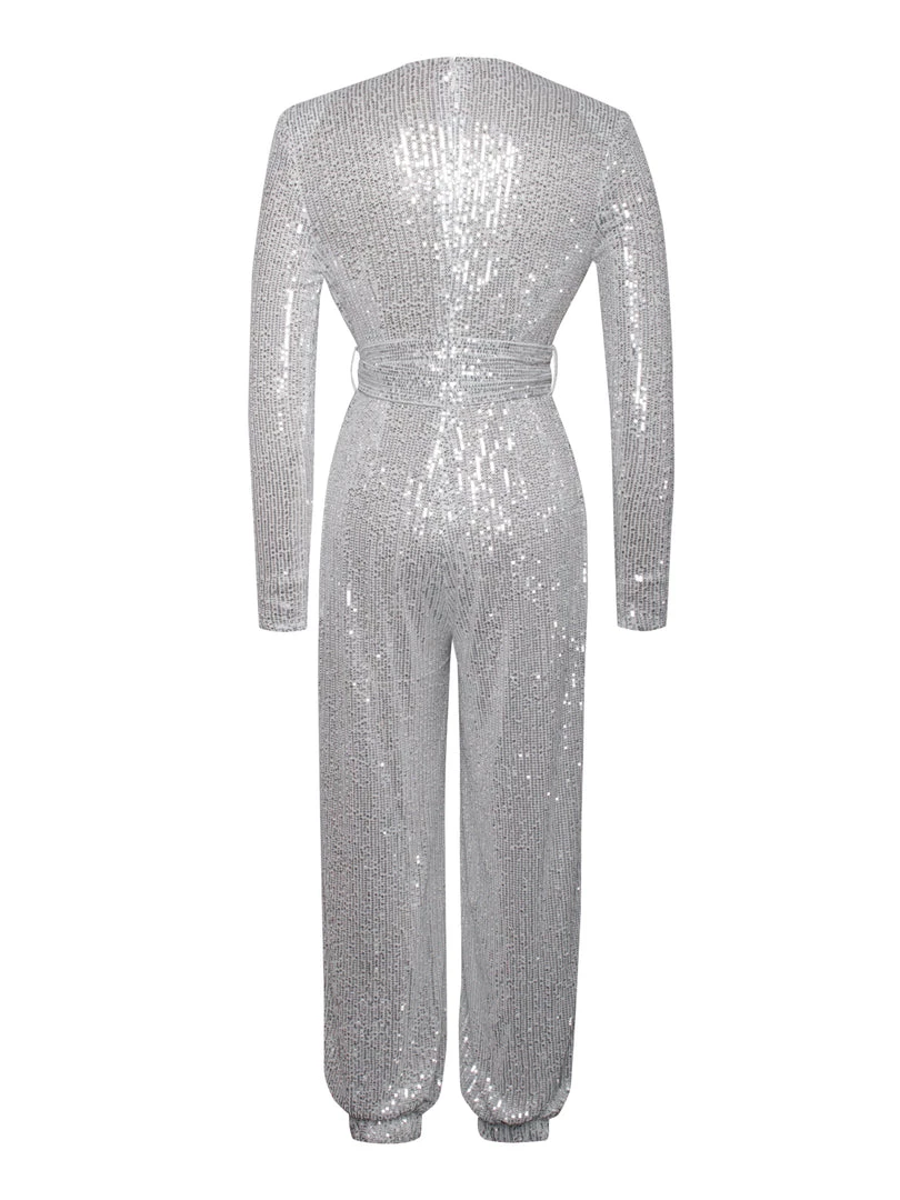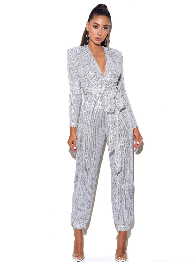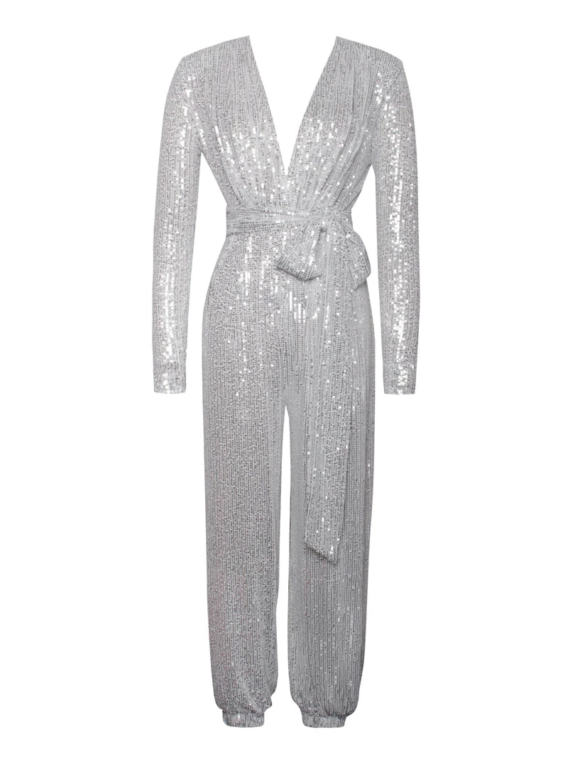 The time 1970 and mood Diva the look our Tasha sequin jumpsuit. Featuring a plunging neckline and adjustable wrap belt, this loose fitting style is was designed for all night movement. Cinched at the hems and cuffs this fully lined Tasha can be styled with a statement earring and heels.