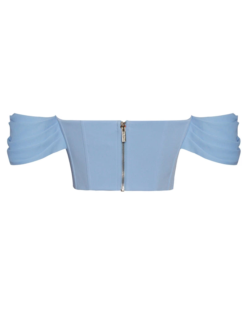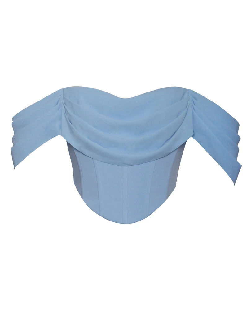 Boned for a figure-sculpting fit, the angelic Tia is a flattering corset top. Fully lined and made with our stretch crepe for a comfortable and breathtaking fit. The draping chiffon shoulders flow naturally into the sweetheart neckline. Match the exposed gold zipper to your favorite gold accessories and pair with the Taya trousers for a complete outfit.