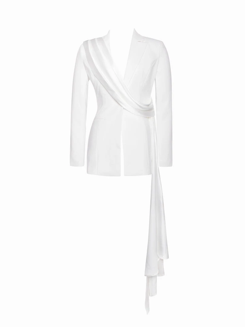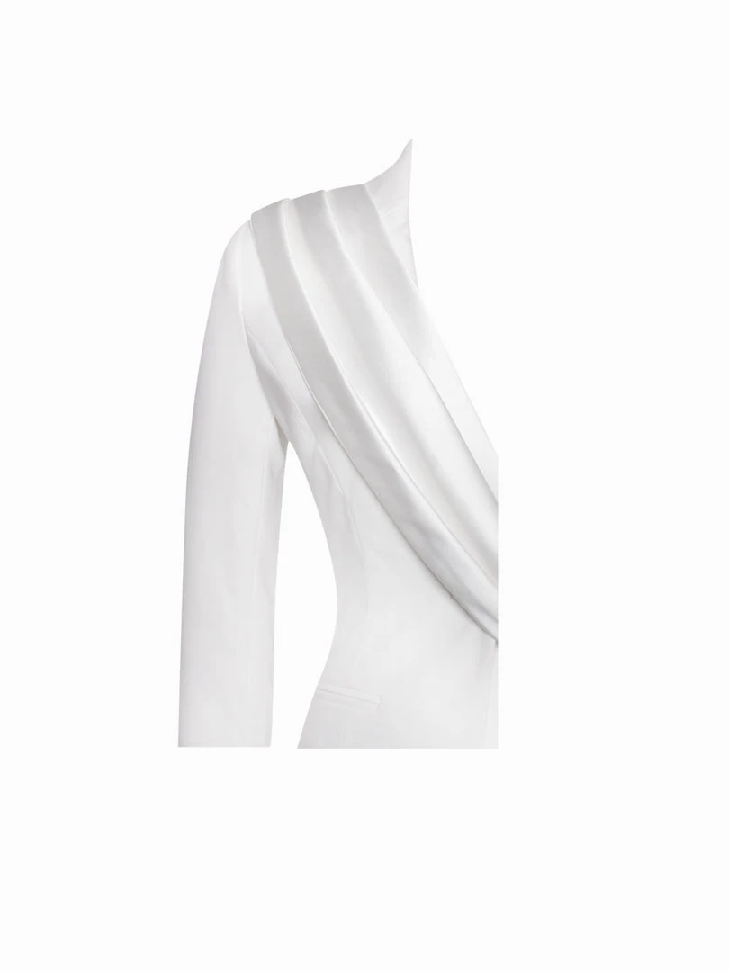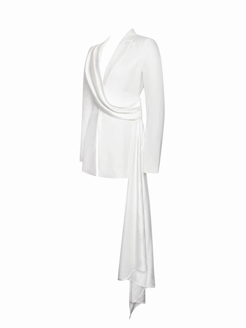 Proving we can do more than glitzy and glam, Vandra is a sharply tailored blazer. Cut from a stretch crepe with shawl lapels and a stunning satin detail that draped from the shoulder the to waist. Vandra has a slightly loose fit that makes it the perfect match for our fitted Vayla White Skinny Crepe Trouser.