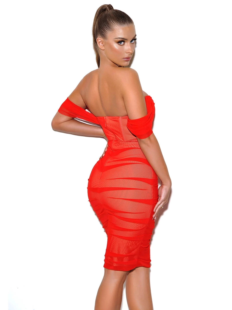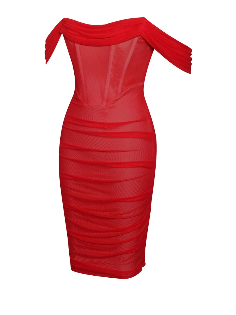 Perfect for the season, our Semi-sheer red Weslee is cut from our signature stretch crepe. Fully lined and ruched throughout the body, this style accents and sculpting your figure. Elegant any way worn, Wesley sleeves can be placed on or draping off the shoulders.