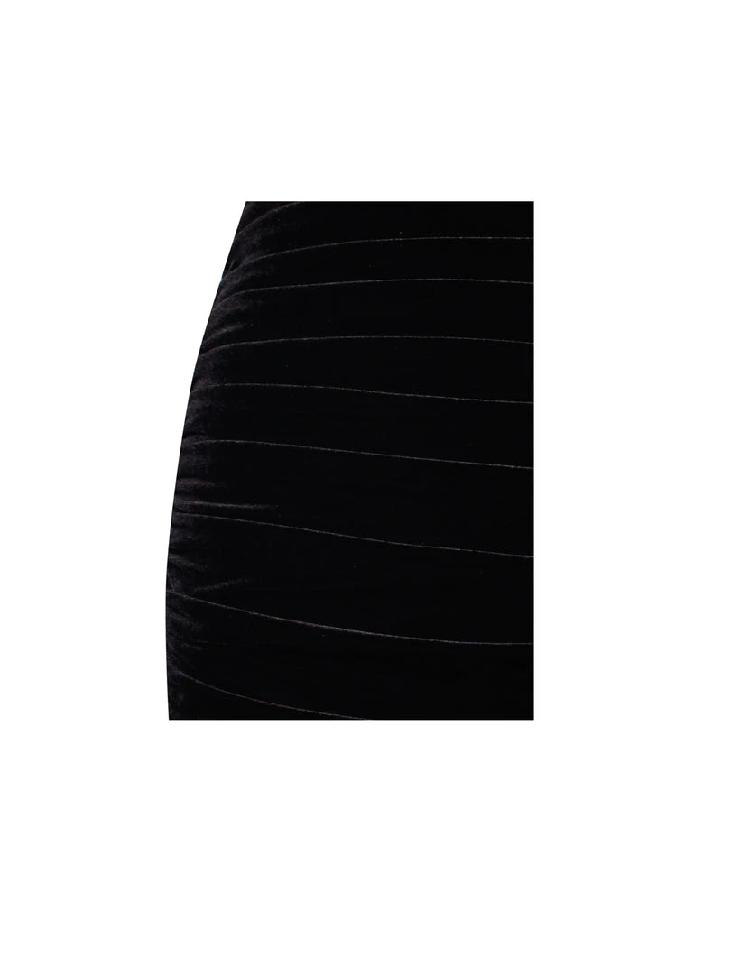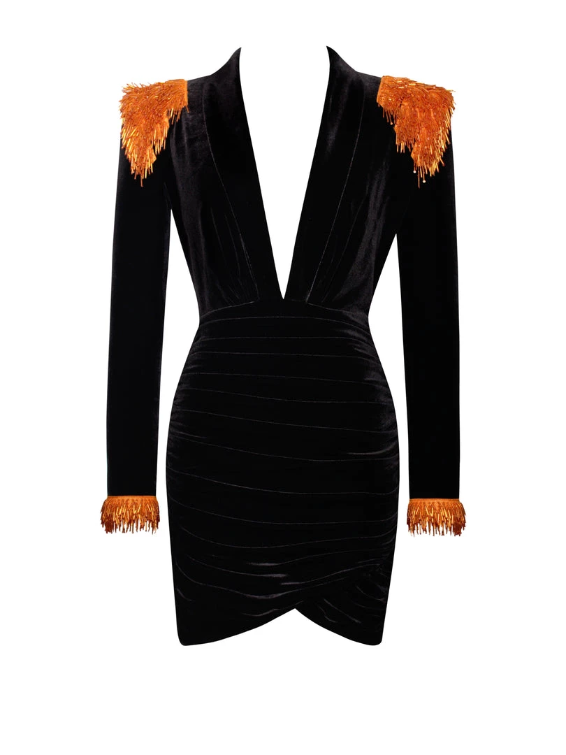 Designed in our New Your City Showroom, this plush velvet dress is made for any big city night. With a plunging neckline, Windsor built-in shoulder pads, and stunning hand-beaded orange accents. Pair this ruched mini with a sleek stilettos and even sleeker ponytail.Â