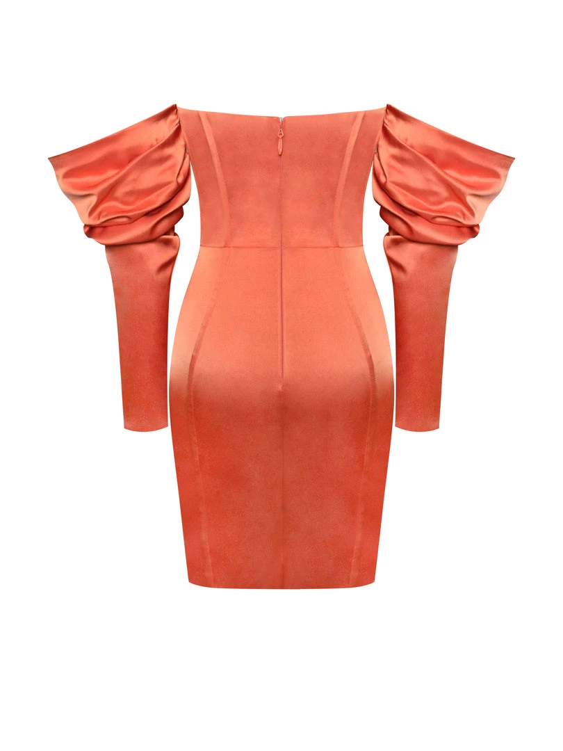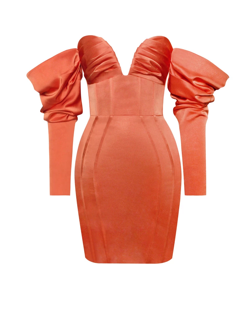 Get the party started in this deep v satin mini dress. Perfect for the seasons to come, this fully lined Zoya features a deep plunging off the shoulder neckline and long ruched sleeves. With a boned corset and wired supported cups, this peached-colored mini was made with you in mind. Finish off this outfit with stilettos and a cute overcoat.